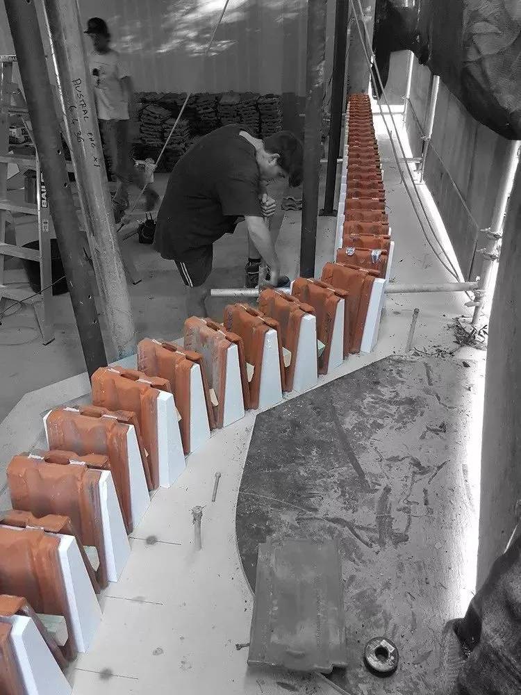 每一塊瓷磚都是根據(jù)其功能來放置的,這些模型是最終設(shè)計(jì)的基礎(chǔ)。尖形瓦片由于其強(qiáng)度放在底部,遮蓋了堅(jiān)固的拱肩。使用等邊瓦片在視平線上減少視覺障礙。在頂部使用斜面瓦片,因?yàn)樗目障陡?,并且向北傾斜。瓦片的變化可以隱藏瓦片的邊緣,從而減少結(jié)構(gòu)負(fù)荷對(duì)建筑的影響。