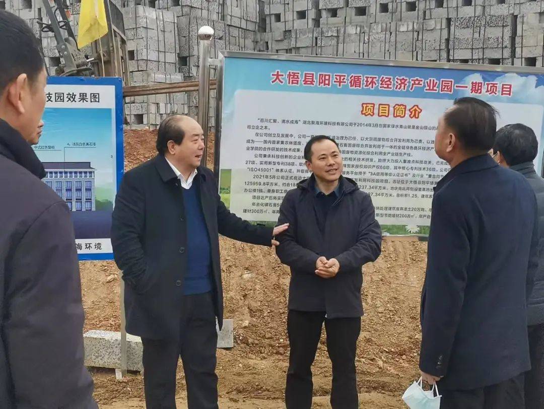 2022年2月10日上午,孝感市人大常委會黨組書記、主任鄧道偉帶領市委常委、副市長程濤,市人大常委會黨組成員、副主任葉華,市人大常委會秘書長胡明剛,市人大城建環(huán)資委主任委員蔣亞林,市人大城建環(huán)資委副主任委員周家剛,大悟縣縣委書記余海群,縣委副書記、縣長鮑克明,縣人大常委會黨組書記、主任程文正等一行,蒞臨湖北聚海環(huán)境科技有限公司投資建設的大悟陽平循環(huán)經(jīng)濟產(chǎn)業(yè)園一期項目,就磷石膏綜合利用工作開展視察調(diào)研。市經(jīng)信局、市生態(tài)環(huán)境局、市稅務局主要領導陪同。