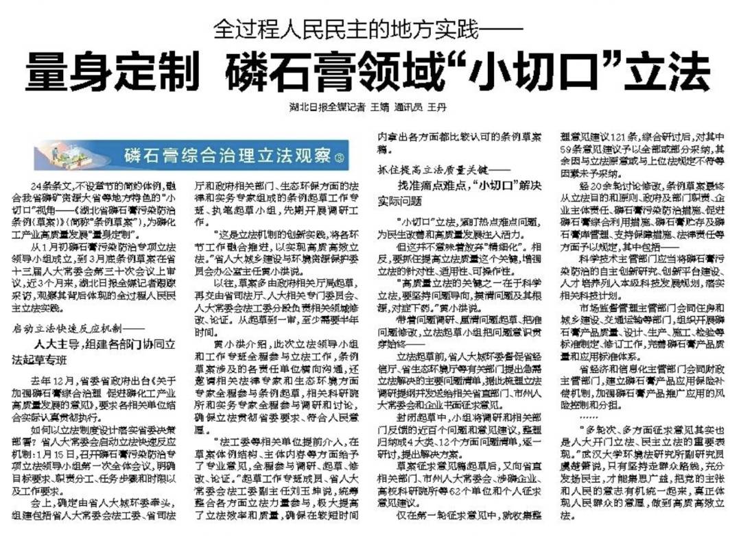 我省磷礦資源豐富,也是磷石膏產(chǎn)生大省。去年12月,省委省政府出臺《關(guān)于加強(qiáng)磷石膏綜合治理 促進(jìn)磷化工產(chǎn)業(yè)高質(zhì)量發(fā)展的意見》。發(fā)揮人大立法主導(dǎo)作用,省人大常委會(huì)啟動(dòng)立法快速反應(yīng)機(jī)制,將磷石膏領(lǐng)域綜合立法納入2022年度重點(diǎn)工作項(xiàng)目,通過制定地方性法規(guī),推動(dòng)意見落實(shí)。湖北日報(bào)開設(shè)“磷石膏綜合治理立法觀察”專欄,探尋立法背后的故事。