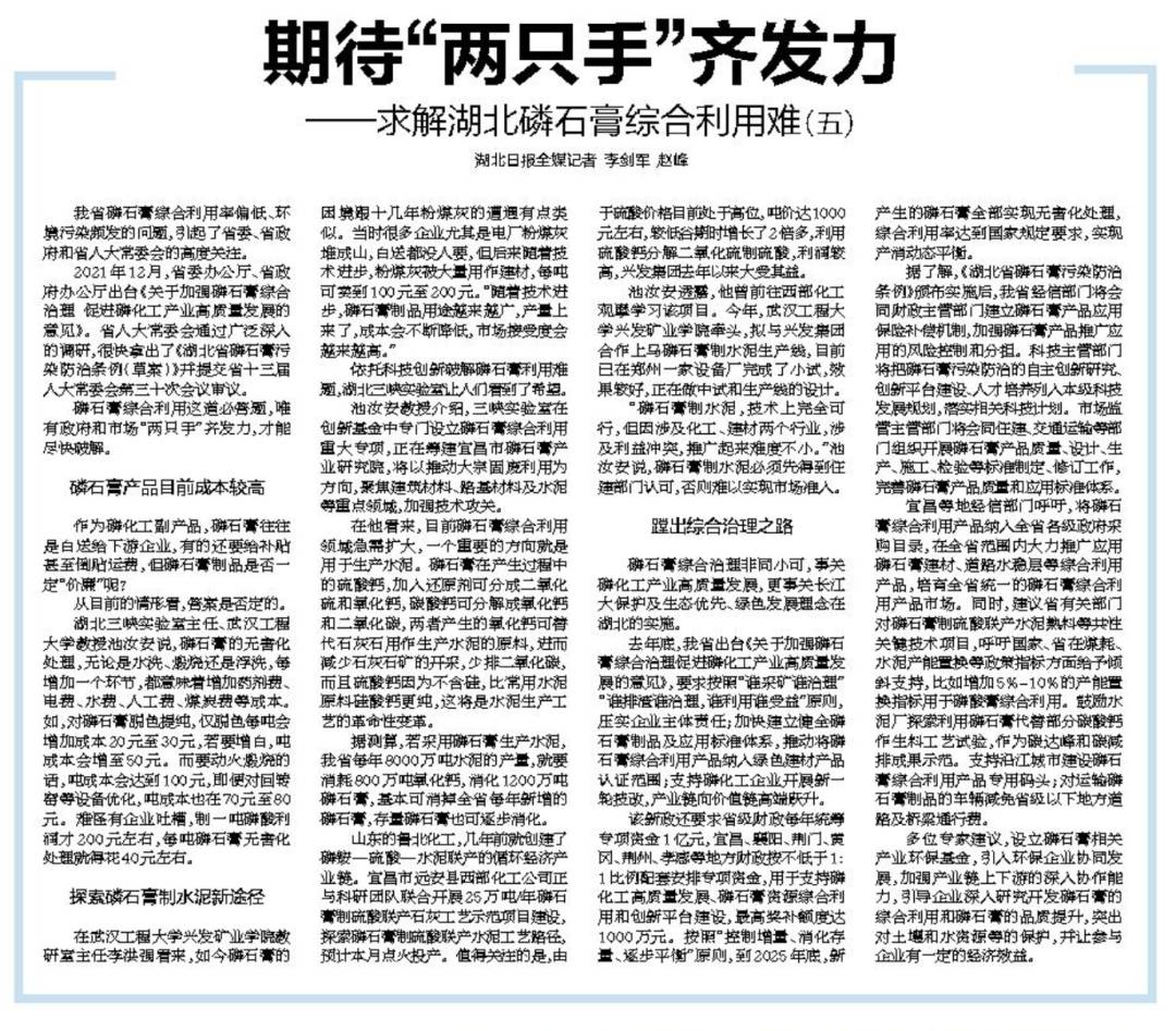 磷石膏綜合治理非同小可,事關(guān)磷化工產(chǎn)業(yè)高質(zhì)量發(fā)展,更事關(guān)長(zhǎng)江大保護(hù)及生態(tài)優(yōu)先、綠色發(fā)展理念在湖北的實(shí)施。