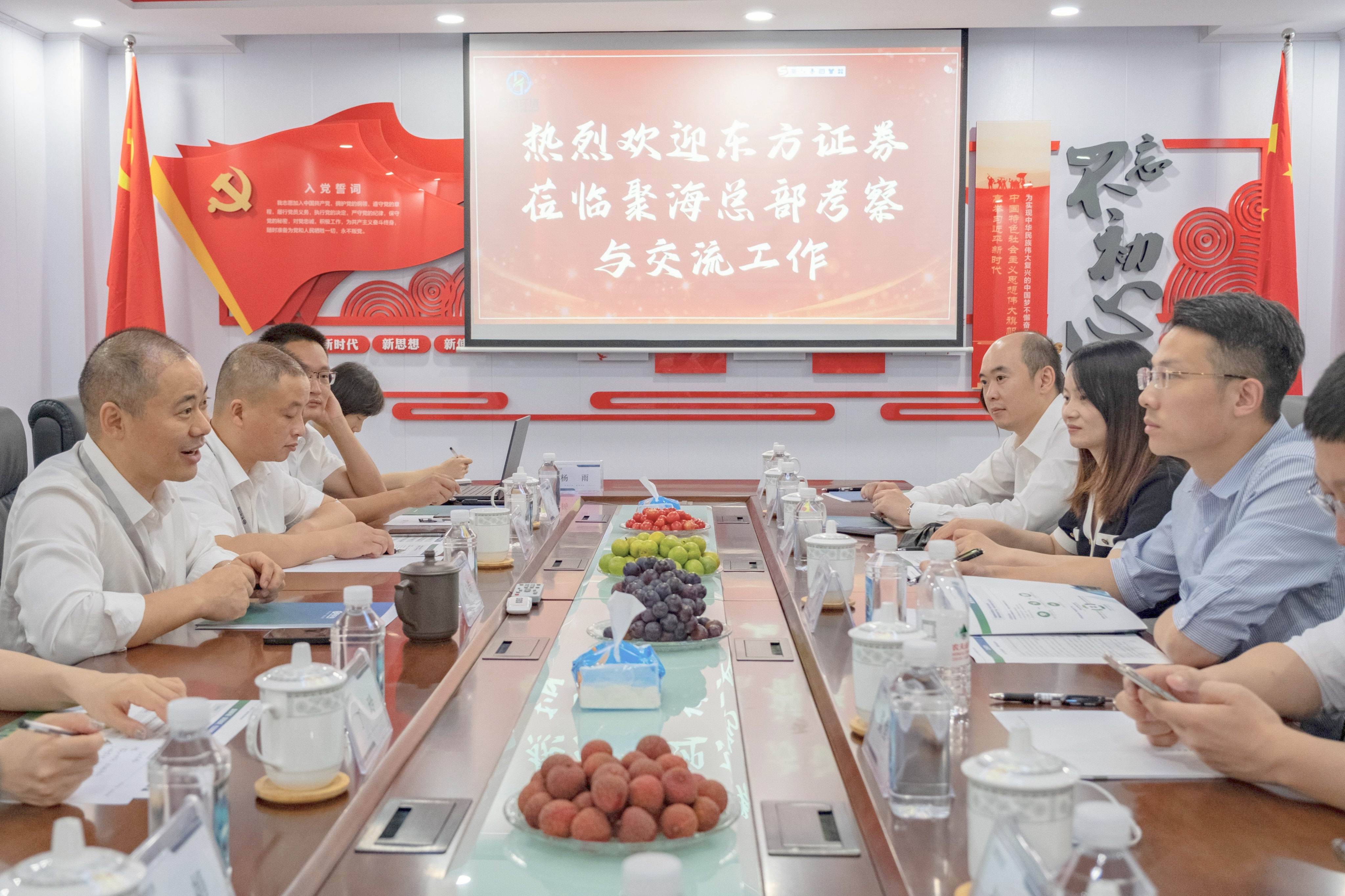 7月21日上午,東方證券武漢云霞路證券營業(yè)部總經(jīng)理吳潮帶隊,攜從北京、上海來的東方投行部門保薦代表人聞亞文、董恒年,東方證券一行共八人蒞臨聚??偛靠疾煺{(diào)研。聚海環(huán)境董事長劉志浩、戰(zhàn)略發(fā)展部副總劉浩、科技研發(fā)中心負責人胡波等陪同接待。