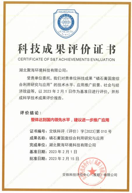 2023年2月13日,由交鐵科技評(píng)價(jià)中心(成都)有限公司邀請(qǐng)專家成立評(píng)價(jià)委員會(huì),對(duì)“磷石膏固廢綜合利用研究與應(yīng)用”項(xiàng)目進(jìn)行了科技成果評(píng)價(jià)。專家組主任由中國建筑材料聯(lián)合會(huì)石膏建材分會(huì)秘書長楊再銀(教授級(jí)高工)擔(dān)任,副主任由北京西南交大工程技術(shù)研究院一帶一路新材料研究所所長余華超教授、中國科學(xué)院成都有機(jī)化學(xué)研究所研究員王公應(yīng)擔(dān)任,組員有:四川大學(xué)郭孝東教授、成都理工大學(xué)許文來教授、綿陽師范學(xué)院李松教授、重慶大學(xué)張?jiān)茟呀淌凇?huì)上湖北聚海環(huán)境科技有限公司董事長劉志浩(教授級(jí)高工)代表項(xiàng)目組對(duì)本項(xiàng)目進(jìn)行了詳盡的介紹。專家委員會(huì)審閱了評(píng)價(jià)資料,聽取了項(xiàng)目組的工作總結(jié)、研究成果報(bào)告、推廣應(yīng)用情況,并對(duì)項(xiàng)目組和項(xiàng)目成果報(bào)告進(jìn)行了質(zhì)詢并形成了一致評(píng)價(jià)結(jié)論——由湖北聚海環(huán)境科技有限公司自主創(chuàng)新研發(fā)、擁有知識(shí)產(chǎn)權(quán)體系的《磷石膏固廢綜合利用研究與應(yīng)用》項(xiàng)目整體達(dá)到國內(nèi)領(lǐng)先水平。