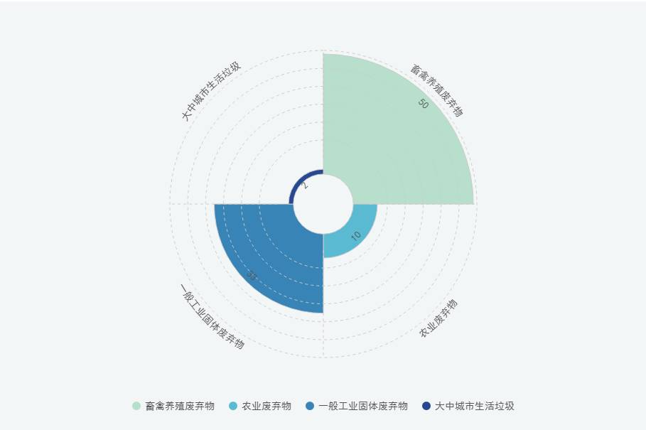 我國(guó)每年產(chǎn)生固體廢棄物近100億噸,其中,每年產(chǎn)生的畜禽養(yǎng)殖廢棄物近50億噸、主要農(nóng)作物秸稈約10億噸、一般工業(yè)固體廢物約33 億噸、大中城市生活垃圾約2億噸。