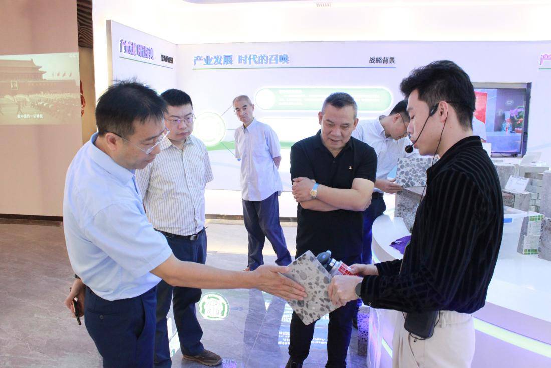 傅強(qiáng)一行首先參觀了聚海環(huán)境總部一樓展廳,公司工作人員介紹公司了企業(yè)文化,演示了公司綠色建材產(chǎn)品防火、保溫、隔音的特性,隨后還參觀了大悟磷石膏產(chǎn)業(yè)園生產(chǎn)車間、磷石膏砂漿生產(chǎn)線、科技樓展廳等。