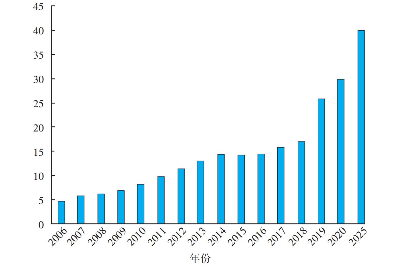 建筑垃圾是新建、改(擴)建、拆除各類建(構(gòu))筑物、管網(wǎng)、道橋等以及房屋裝飾裝修過程中產(chǎn)生的廢物總稱,主要包括工程渣土、廢棄泥漿、工程垃圾、拆除垃圾和裝修垃圾等。據(jù)中國環(huán)聯(lián)公布的數(shù)據(jù),當前我國建筑垃圾已占城市垃圾總量的40%以上,建筑垃圾年產(chǎn)生量超過3.0×109t,預計2025年將達到4.0×109t,如圖1所示。但目前大中城市的建筑垃圾資源化率不超過10%,與日本、德國、美國等發(fā)達國家的建筑垃圾資源化水平差距較大。