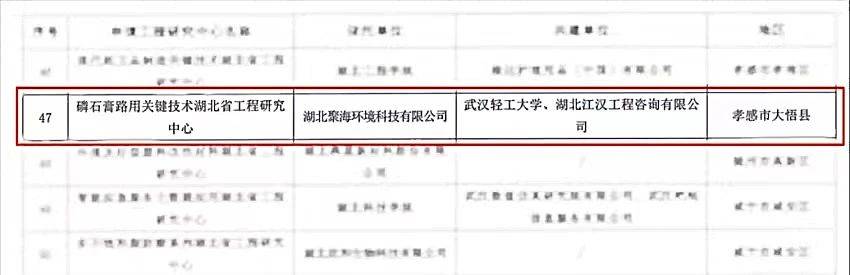 11月22日,省發(fā)展和改革委員會(huì)公布2023年全省53家工程研究中心認(rèn)定名單,以大悟縣的湖北聚海環(huán)境科技有限公司為依托單位,武漢輕工大學(xué)、湖北江漢工程咨詢有限公司共建的磷石膏路用關(guān)鍵技術(shù)湖北省工程研究中心名列其中。