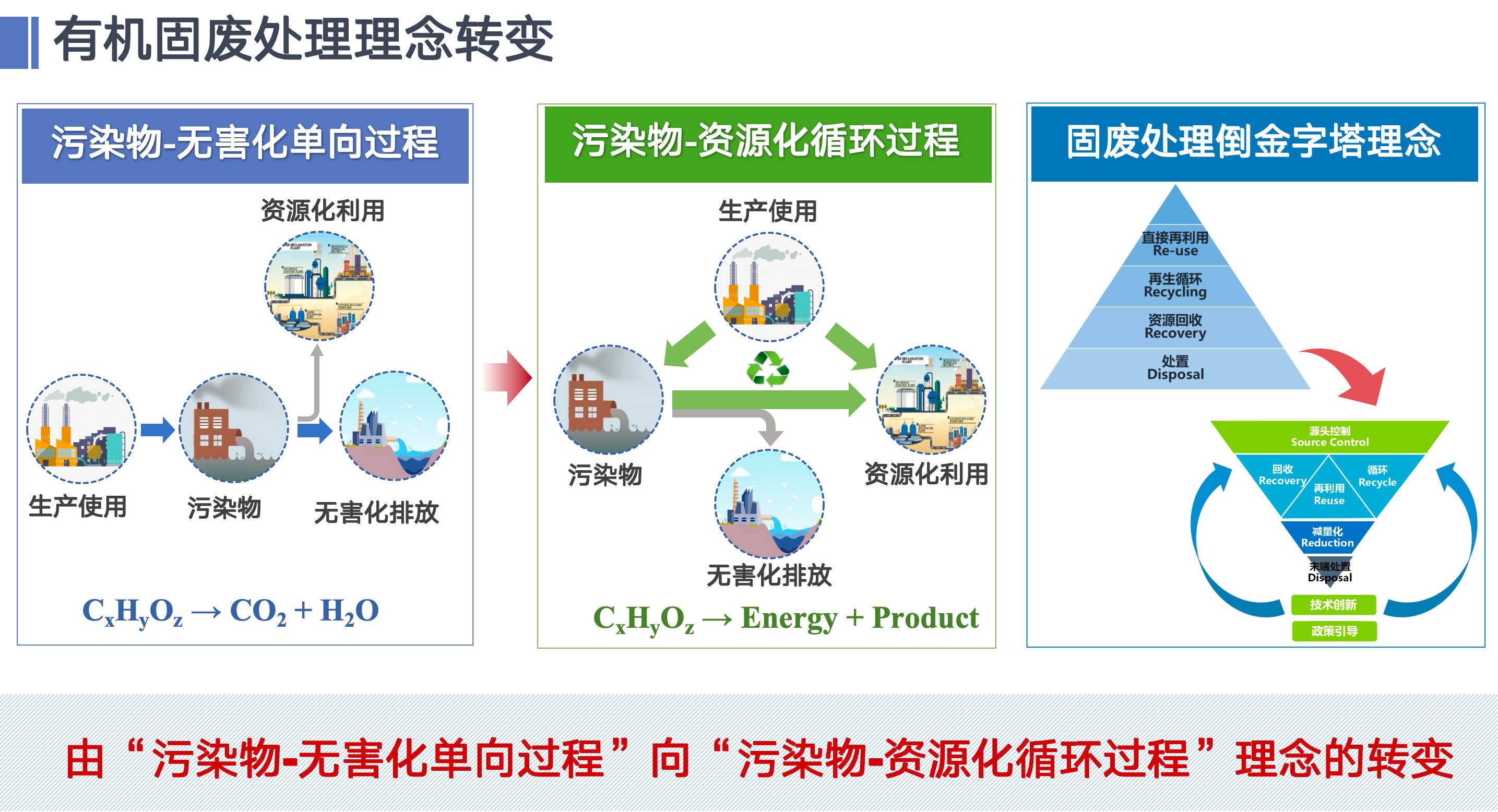 過去多年的環(huán)境治理核心是污染控制,有機(jī)固廢處置以無害化為目標(biāo)?,F(xiàn)在面臨生態(tài)環(huán)境健康發(fā)展、降碳減污、綠色發(fā)展的發(fā)展趨勢,未來有機(jī)固廢處置技術(shù)不能只關(guān)注無害化,而是以無害化為目標(biāo),充分考慮資源化的手段,實(shí)現(xiàn)污染物-資源化循環(huán)過程。