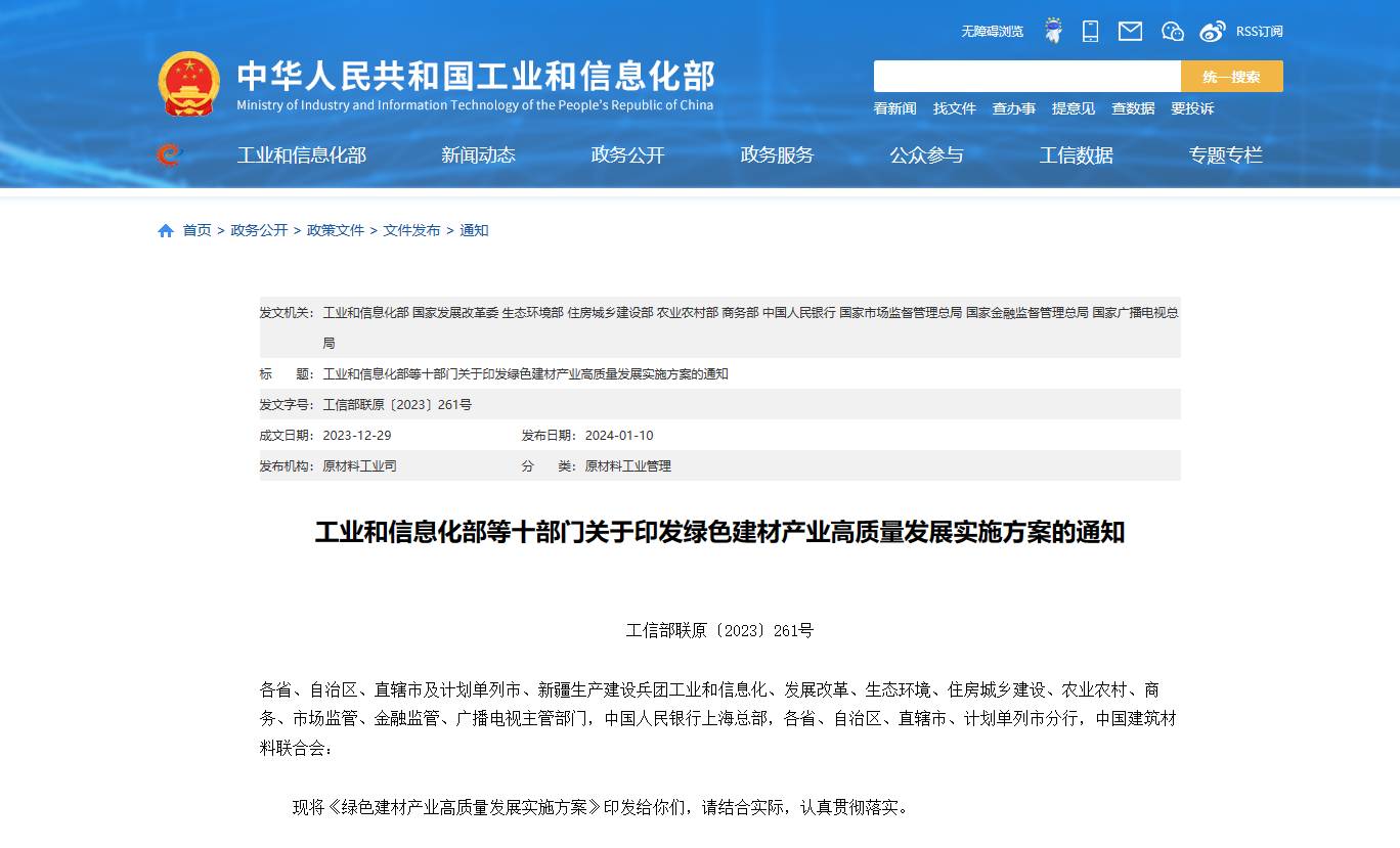 近日,工業(yè)和信息化部、國(guó)家發(fā)展改革委、生態(tài)環(huán)境部、住房城鄉(xiāng)建設(shè)部、農(nóng)業(yè)農(nóng)村部、商務(wù)部、中國(guó)人民銀行、市場(chǎng)監(jiān)管總局、金融監(jiān)管總局、廣電總局等十部門聯(lián)合發(fā)布《綠色建材產(chǎn)業(yè)高質(zhì)量發(fā)展實(shí)施方案》(以下簡(jiǎn)稱《實(shí)施方案》),該方案的出臺(tái)旨在推動(dòng)我國(guó)綠色建材產(chǎn)業(yè)邁向更高質(zhì)量的發(fā)展階段,具有重要的戰(zhàn)略和政策意義。