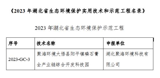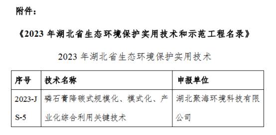 為助力打好污染防治攻堅戰(zhàn)、推動減污降碳協(xié)同發(fā)展,加快先進適用生態(tài)環(huán)境保護技術成果推廣應用,提升生態(tài)環(huán)境保護產(chǎn)業(yè)綠色低碳發(fā)展水平,湖北省環(huán)境產(chǎn)業(yè)保護協(xié)會開展2023年生態(tài)環(huán)境保護實用技術裝備和示范工程推廣工作,編制并形成了《2023年湖北省生態(tài)環(huán)境保護實用技術裝備和示范工程名錄》。湖北聚海環(huán)境科技有限公司申報的“磷石膏降碳式規(guī)?;⒛J交?、產(chǎn)業(yè)化綜合利用關鍵技術”及“聚海環(huán)境大悟縣陽平鎮(zhèn)磷石膏全產(chǎn)業(yè)鏈綜合開發(fā)科技園”成功入選該名錄。