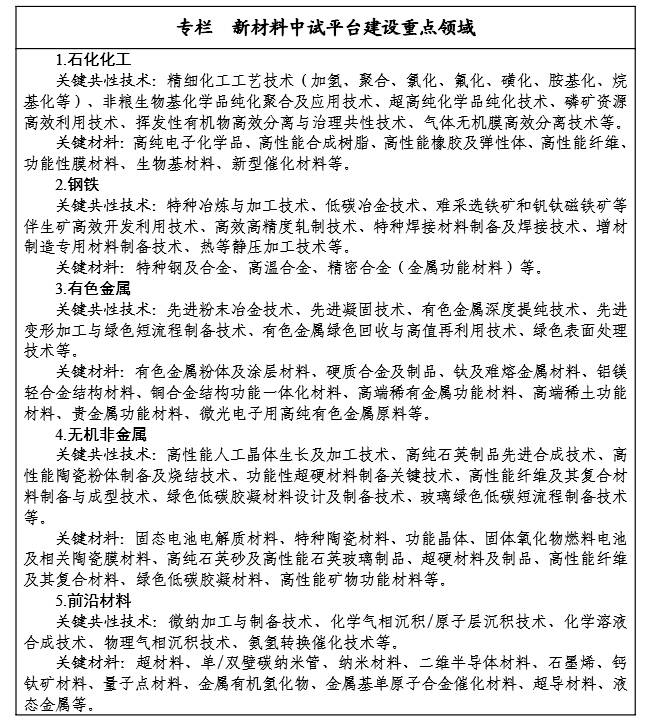 圍繞加快推進(jìn)新型工業(yè)化、建設(shè)制造強國戰(zhàn)略需求,著眼事關(guān)國家安全和經(jīng)濟(jì)建設(shè)的關(guān)鍵短板材料、引領(lǐng)新興產(chǎn)業(yè)和未來產(chǎn)業(yè)發(fā)展的前沿材料,聚焦“觸類旁通”效應(yīng)明顯、行業(yè)進(jìn)步帶動性強的關(guān)鍵共性技術(shù),確定新材料中試平臺建設(shè)的重點領(lǐng)域。